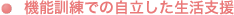 - 完備された機能訓練施設で、ご入居者様の自立支援をお手伝いさせていただきます。また、目標を持った生活を送る為に、生活相談などを通して、それぞれに無理のない目標設定をさせていただく支援をさせていただきます。