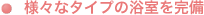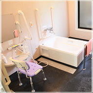 - ご入居者様の状態に合せた各個浴(リフト浴と言われる座ったまま入浴できるもの)や機械浴(寝た状態で入浴可能なもの)を完備している為、すべての人に安全に入浴して頂くことが可能です。